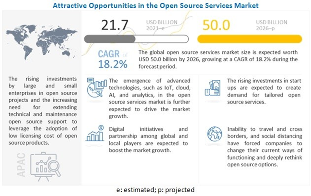 마켓앤마켓이 '2026년까지 오픈소스 시장 전망 (Open Source Services Market - Global Forecast to 2026)' 보고서를 발표하고, 2026년까지 연평균 18.2% 성장할 것으로 전망했습니다. 2021년 217억 달러로 추정되는 시장 규모가 2026년 500억 달러로 성장할 것으로 추정했습니다. (자료:MarketsandMarkets)