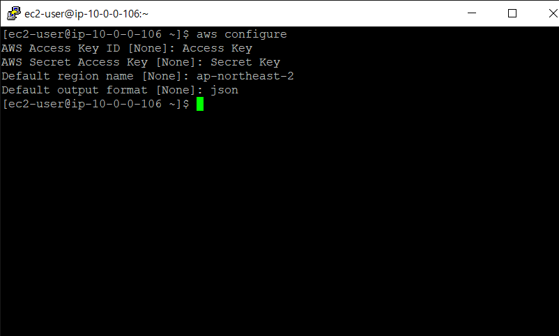 2.2 aws configure 명령어를 통해 사용자를 등록해줍니다.
