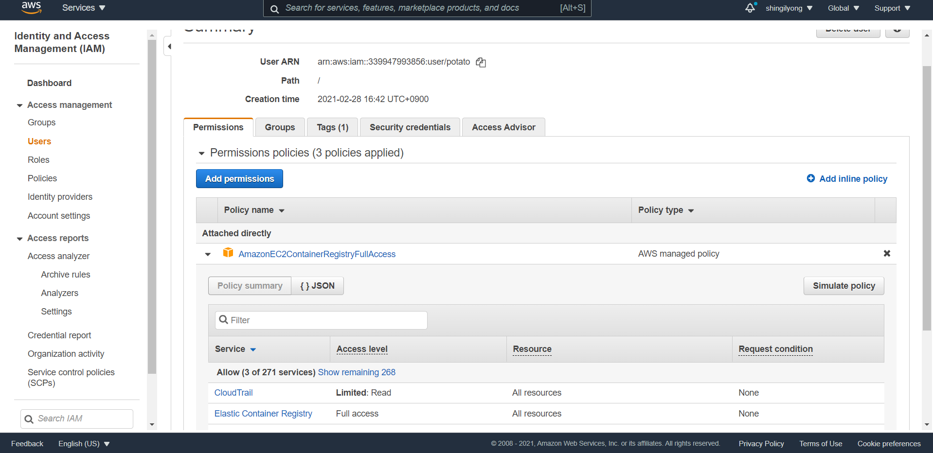 1.1 AWS 사용자가 ECR 서비스에 액세스를 위해 권한 추가작업 필요.