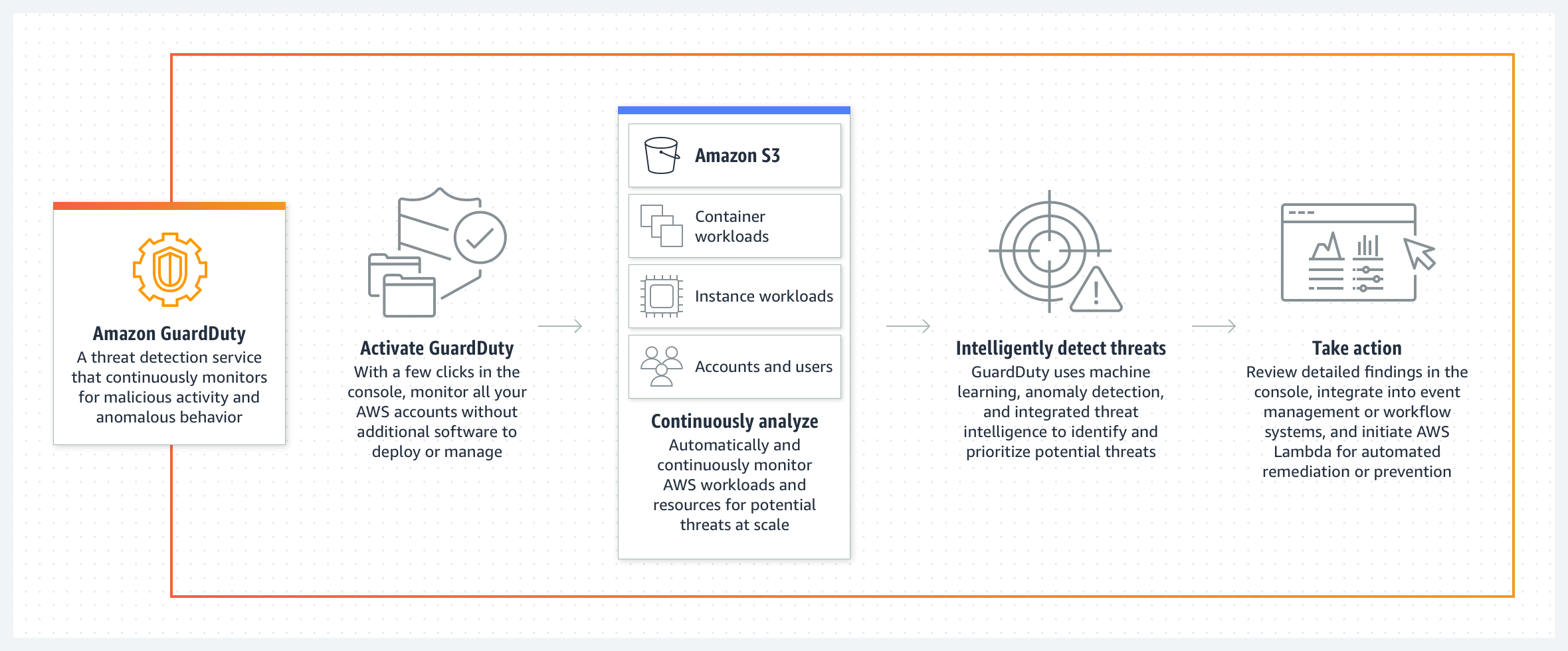 Amazon GuardDuty는 AWS 계정 및 워크로드에서 악의적 활동을 모니터링하고 상세한 보안 결과를 제공하여 가시성 및 해결을 촉진하는 위협 탐지 서비스입니다.