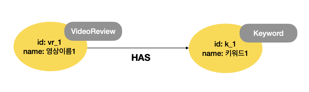 위 그림처럼, VideoReview는 한 노드의 label이고 id와 name은 key-value 가 쌍을 지어 노드의 속성을 정의하게 됩니다. Role/Type의 경우는 보통 label로 표현하고, 특정 노드의 특징을 표현하기 위해서는 property(속성)을 사용할 수 있습니다.