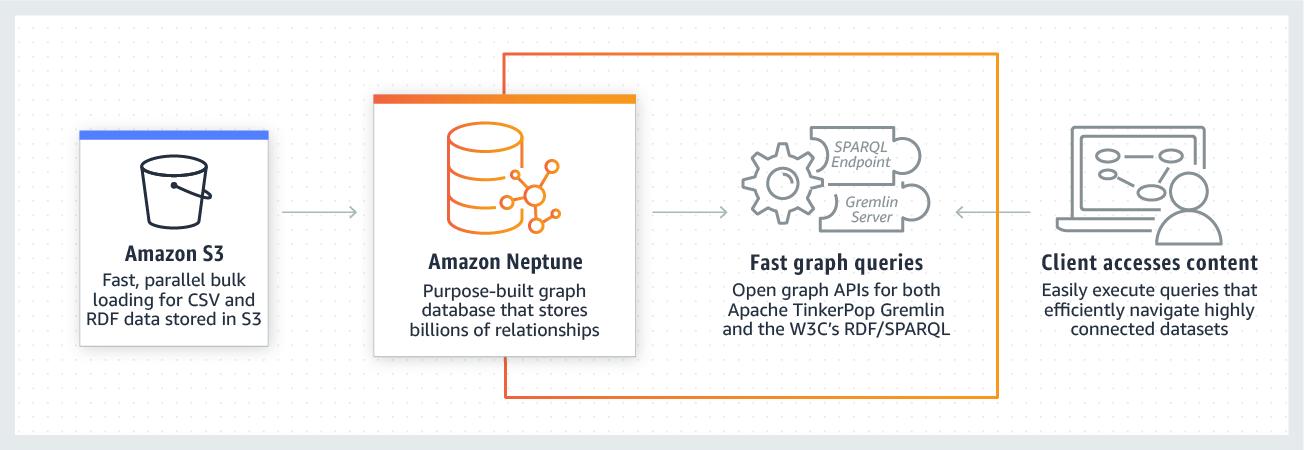 Amazon Neptune는 아마존에서 제공하는 완전관리형 그래프 데이터베이스 서비스입니다. 완전관리형(Fully-Managed)는 AWS가 모두 관리하는 형태로, 쉽게 백업과 가용성에 대한 부분을 보장받을 수 있습니다. 서비스 제공을 위한 인프라를 AWS에서 제공해주기 때문에 편리한 사용이 가능한데, Neptune 데이터베이스 서비스는 완전관리형이기 때문에 설치과정을 포함해 모니터링, 이벤트 알림, 데이터베이스 복제 등에 있어서 빠르고 편리하게 작업할 수 있습니다.