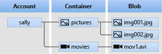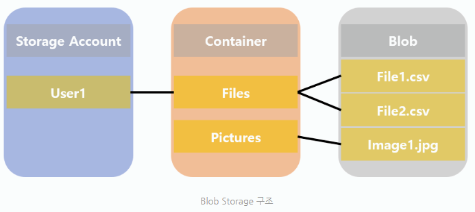 - 여러 Blob의 집합이며, 파일 시스템의 폴더와 유사하다고 볼 수 있습니다. 하나의 Storage Account에는 제한 없이 많은 수의 컨테이너를 생성할 수 있고, 컨테이너 역시 숫자에 제한 없이 많은 Blob을 가질 수 있습니다.
