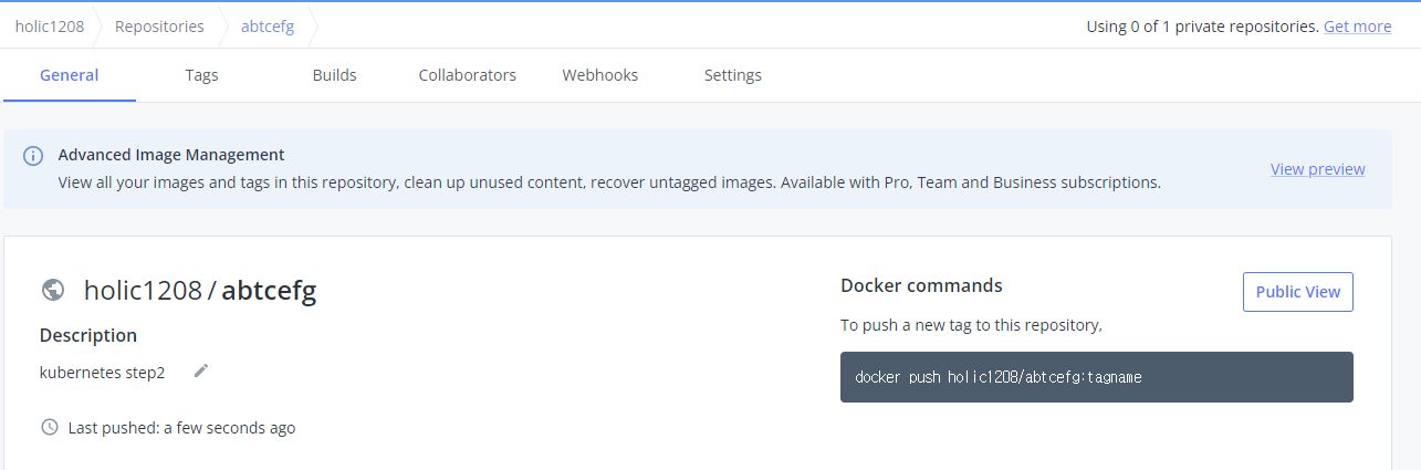 Docker hub repository에서 업로드 된 이미지를 확인해볼게요.