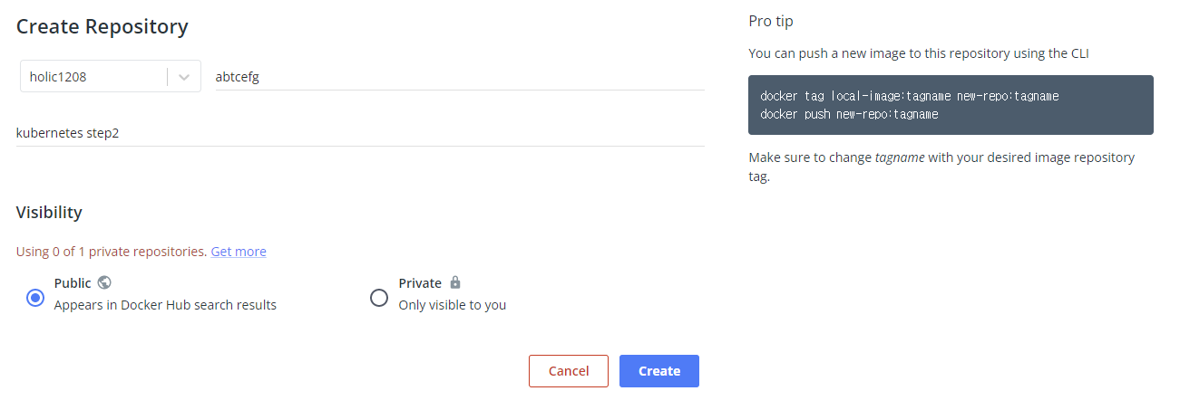1. 도커 허브 로그인 후 Repository 생성