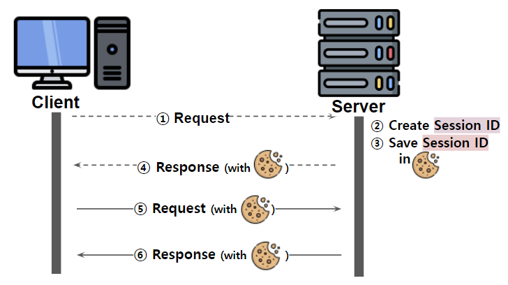 - 서버에서는 클라이언트를 구분하기 위해 세션ID를 부여하여 웹 브라우저가 서버에 접속해서 브라우저를 종료할 때까지 인증상태 유지