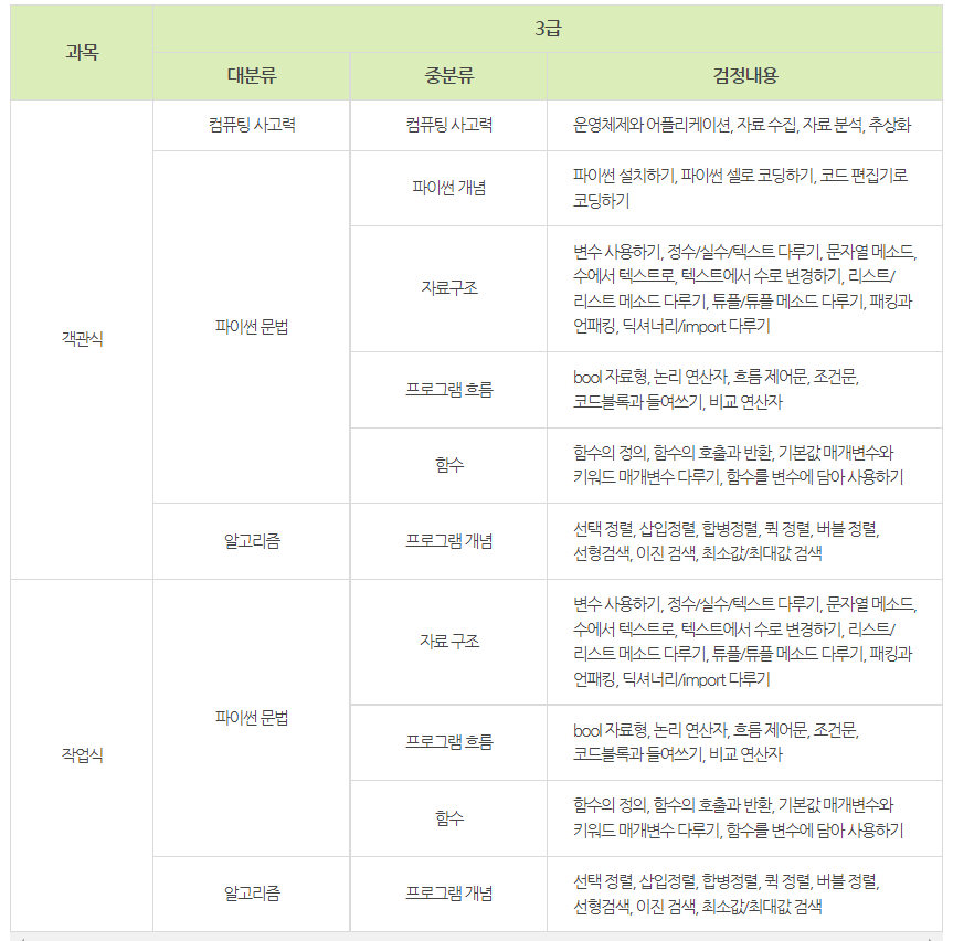 - 파이썬 마스터 3급: 파이썬 언어를 이용하여 알고리즘을 이해하고 코딩할 수 있음