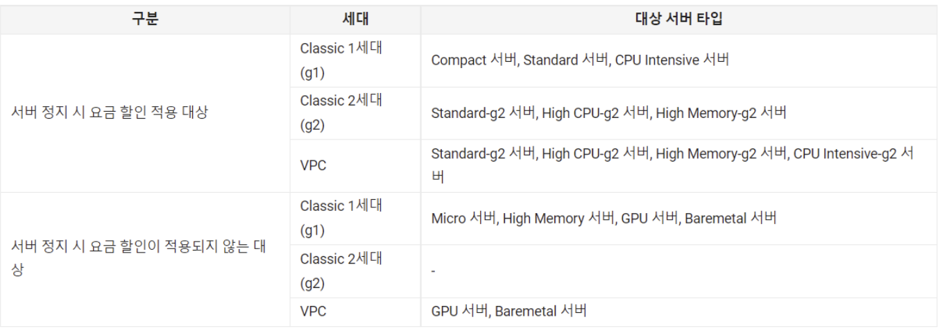 - 표준 요금 적용 서버는 서버 정지를 하더라도 CPU와 메모리 요금이 발생한다.