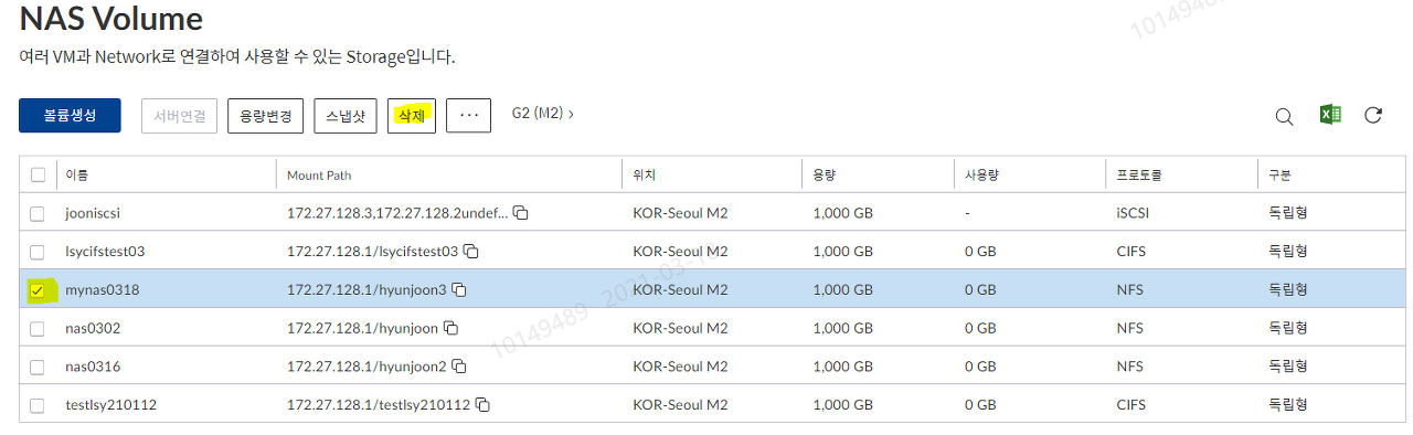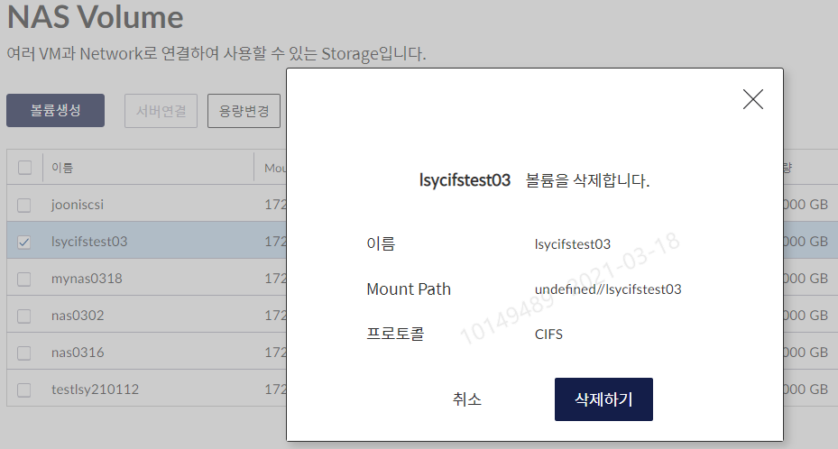 서버리스트에서 cloud NAS 를 사용하고 있는 서버의 CIP 연결 및 NAS 연결(Mount 등) 해제 후 볼륨 리스트에서 삭제하고자 하는 볼륨을 선택 -> 상단 ‘삭제’ 클릭