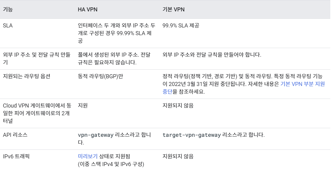 - HA VPN 터널은 IPv6 트래픽 교환을 지원하지만 기본 VPN 터널은 이를 지원하지 않습니다. IPv6에 대한 HA VPN 지원은 미리보기 상태입니다.