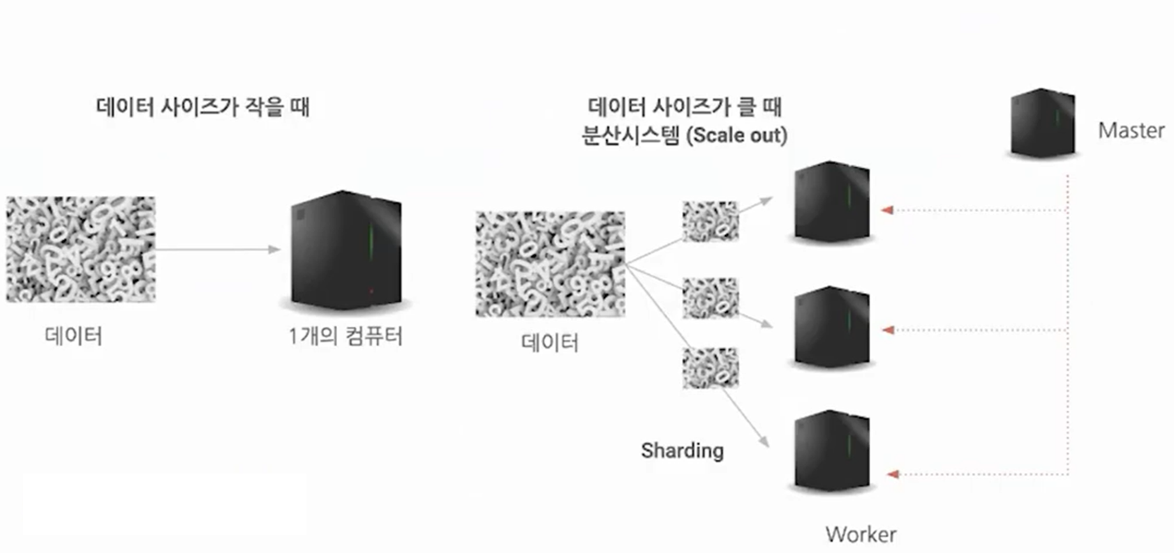 master node는 관리의 역할 worker node는 분석 역할을 합니다. 사이즈가 큰 데이터를 쪼개고(Sharding) 쪼갠 데이터를 각 worker node에 할당(mapping)해 줍니다. 할당 받은 작은 데이터들을 동시에 worker node들이 처리하게 됩니다.