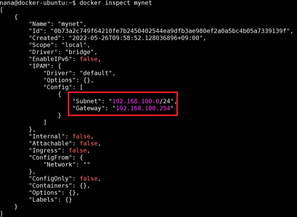 docker network create --driver bridge --subnet 192.168.100.0/24 --gateway 192.168.100.254 mynet