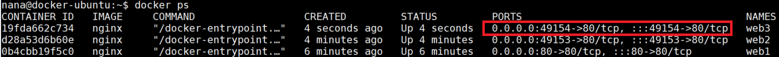 docker run -d -P --name web3 nginx