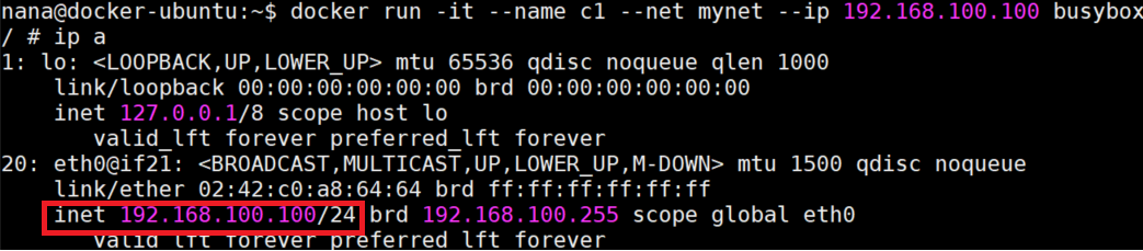 docker run -it --name c1 --net mynet --ip 192.168.100.100 busybox