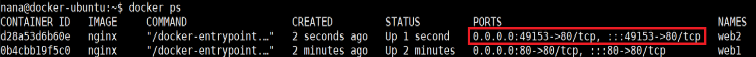 docker run -d -p 80 --name web2 nginx