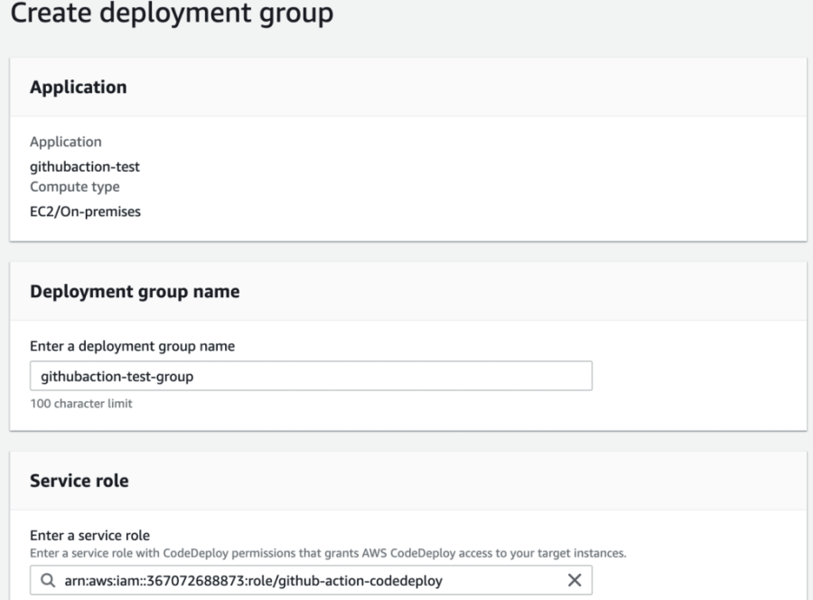 위에서 deployment group 이름을 입력하고 위에서 생성한 codedeploy role을 지정합니다.