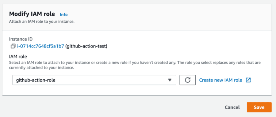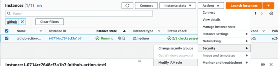 그리고 생성 된 인스턴스의 role을 위에서 생성한 role로 변경합니다. security > modify IAM role