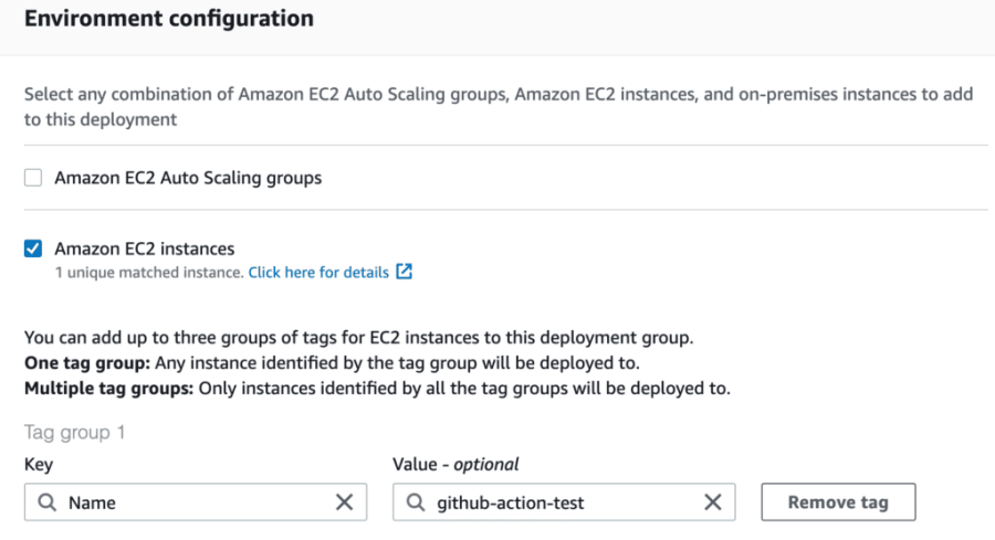 Auto Scaling 설정은 지금 하지 않을 것이므로 Amazon EC2 instances를 체크하고, 배포될 대상 인스턴스를 Tag에 등록해 줍니다.