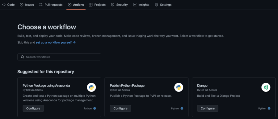 배포해야되는 Repositories에서 Actions 탭을 선택하고, New workflow를 클릭합니다.