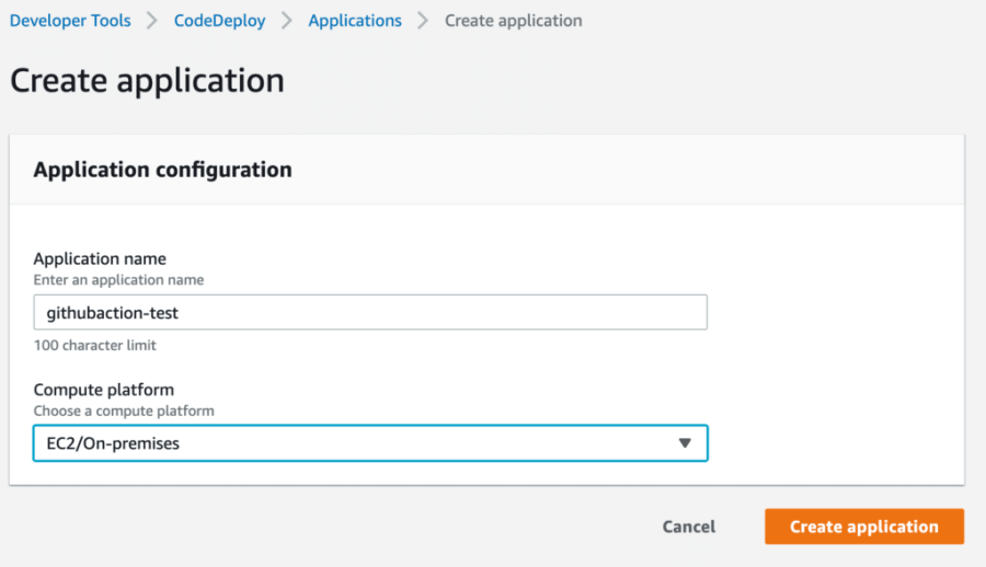 본문의 예제는 ec2 인스턴스 하나에 배포하는 것이므로 EC2/On-premises 를 선택하고 Create Application을 진행합니다. 다음으로 deployment group을 생성해야 합니다.