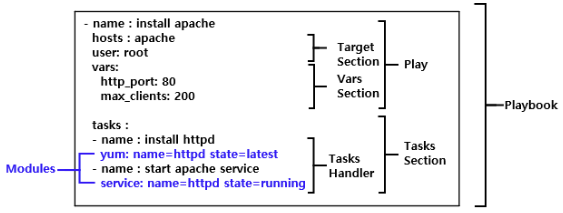 | 구성 | 하나 이상의 Play 들로 이루어져 있습니다. - Plays : 서버(그룹)에 대해 정의된 role 들을 실행 시키는 것. 여러 개의 tasks로 이루어져 있습니다. - tasks : ansible의 작업 단위 (ad-hoc 명령을 사용하여 단일 작업을 한 번 실행할 수 있습니다.) - Modules ![]() |