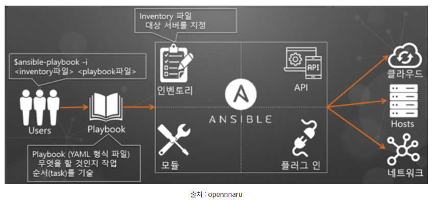 | 실행 방법 | Ansible 명령을 사용해서 단일 모듈을 호출 가능 Ansible-playbooks 명령을 통해서 여러 모듈 호출 가능 |