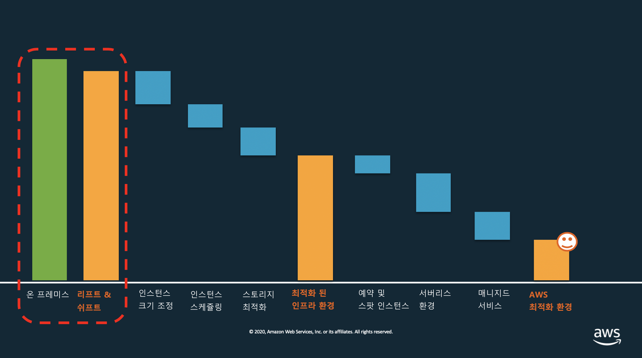 그림과 같이 단순 클라우드로 온프라미스 환경을 그대로 옮기면 비용이 거의 절감이 되지 않지만 최적화 과정을 거치면 비용이 많이 절감된다는 것을 알 수 있습니다.