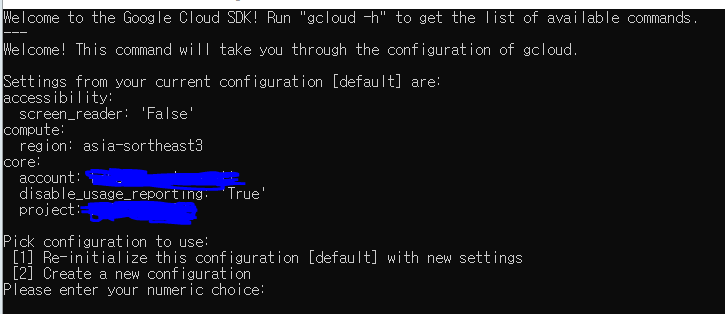 sdk에 연결되어 있는 계정과 프로젝트id 그리고 컨피규레이션을 어떻게할건지 묻습니다. 사용하고자하는 아이디와 프로젝트가 맞다면 1번을 선택해주시고 아니면 2번을 눌러 나오는 안내에 맞게 설정하시면 됩니다.