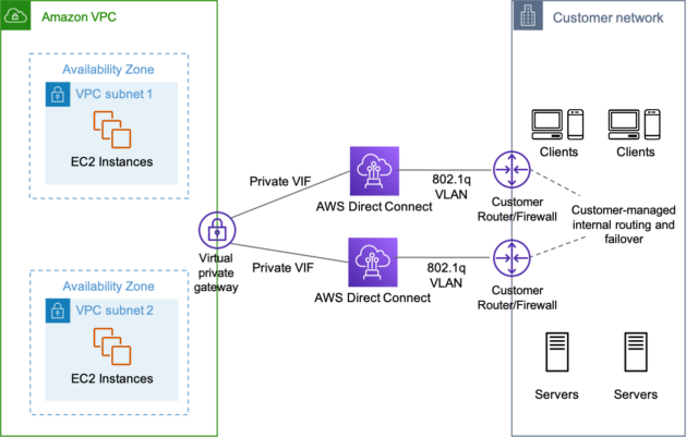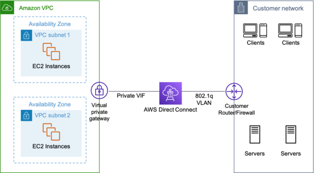 가장 간단한 구성으로 온 프레미스와 AWS VPC 간의 통신을 위해 Direct Connect를 쓰는 구성입니다.