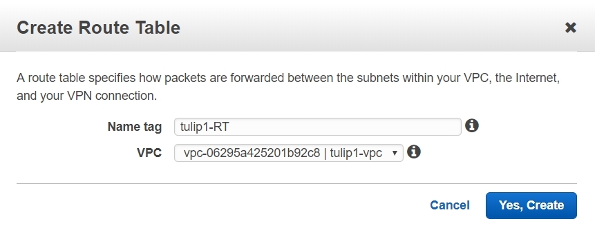 2. 다음의 창이 뜹니다. 이름과 VPC를 선택해 줍니다. [Yes, Create]버튼을 눌러 줍니다
