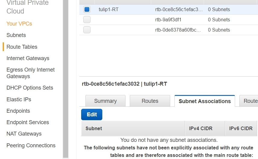 3. 아래에 표시된 것과 같이 어떠한 서브넷과도 연결되 있지 않았다고 나와 있으므로 Public Subnet 과 연결을 시켜주어야 합니다. [Edit] 클릭해 주세요