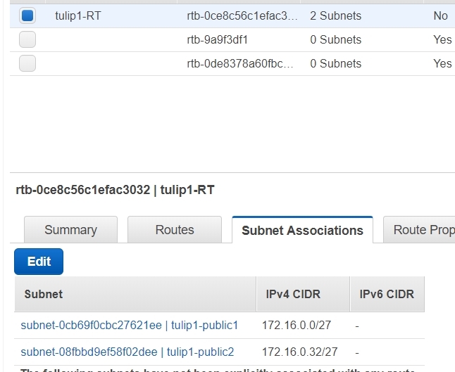 그러면 아래와 같이 성공적으로 두개의 public subnet에 tulip1-RT가 연결되어 있음을 볼 수 있습니다