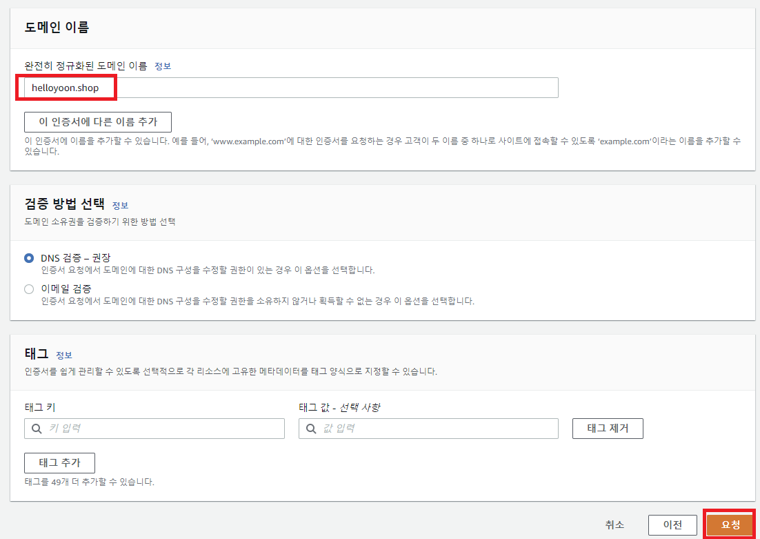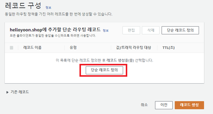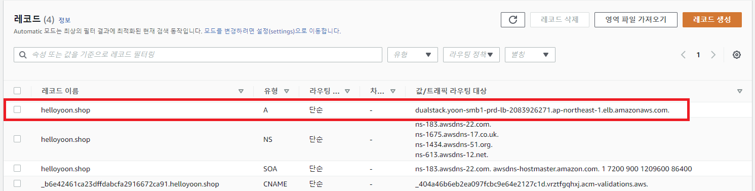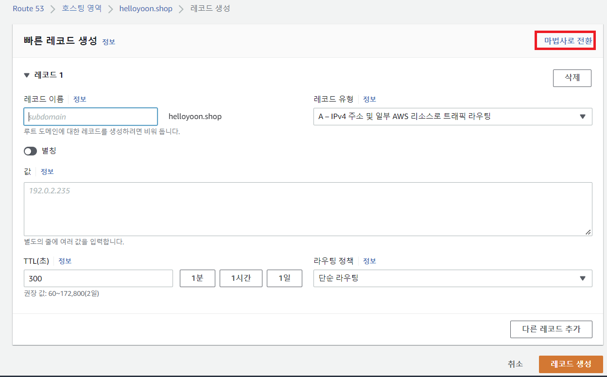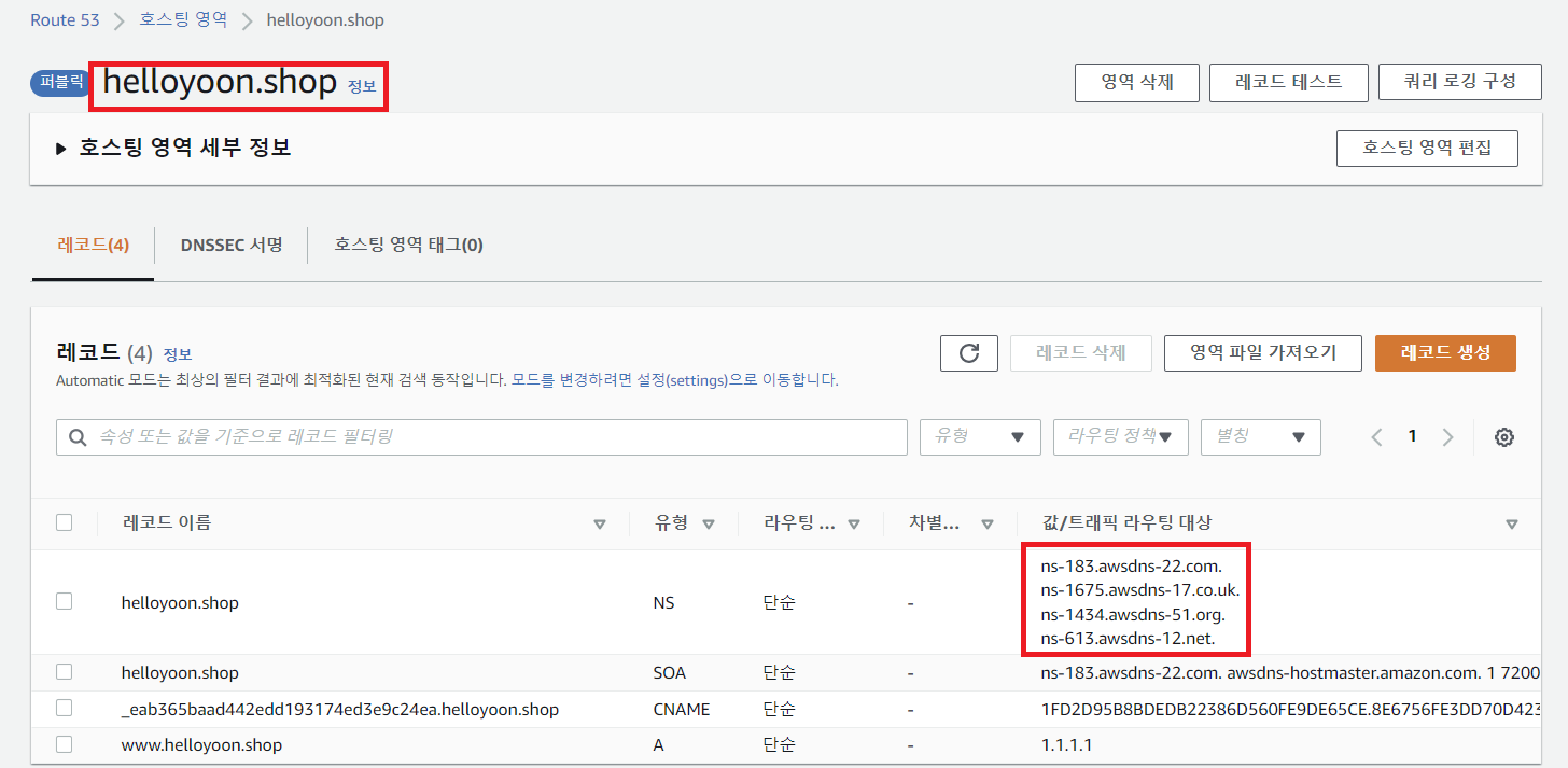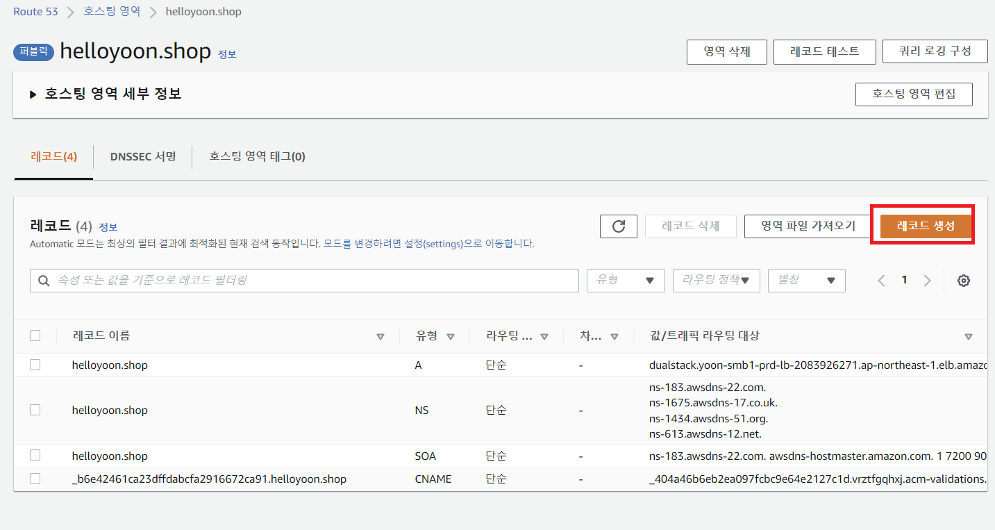 - 레코드 이름은 실제로 사용할 도메인 이름(인증서 등록 도메인 이름)으로 기재