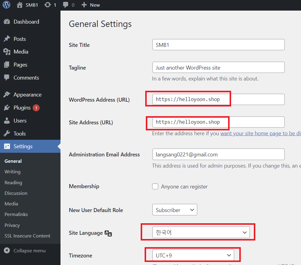 - wordpress address url, site address url를 인증서를 받은 도메인으로 수정