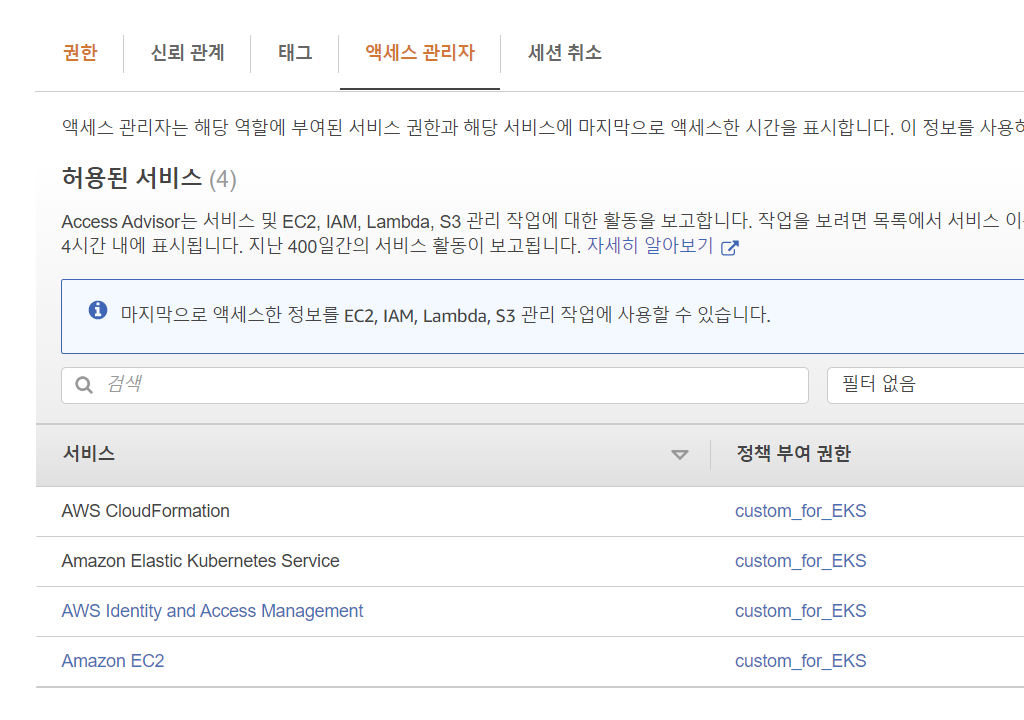 CloudFormation, AWS EKS , IAM , EC2 서비스에 대한 권한을 부여한다