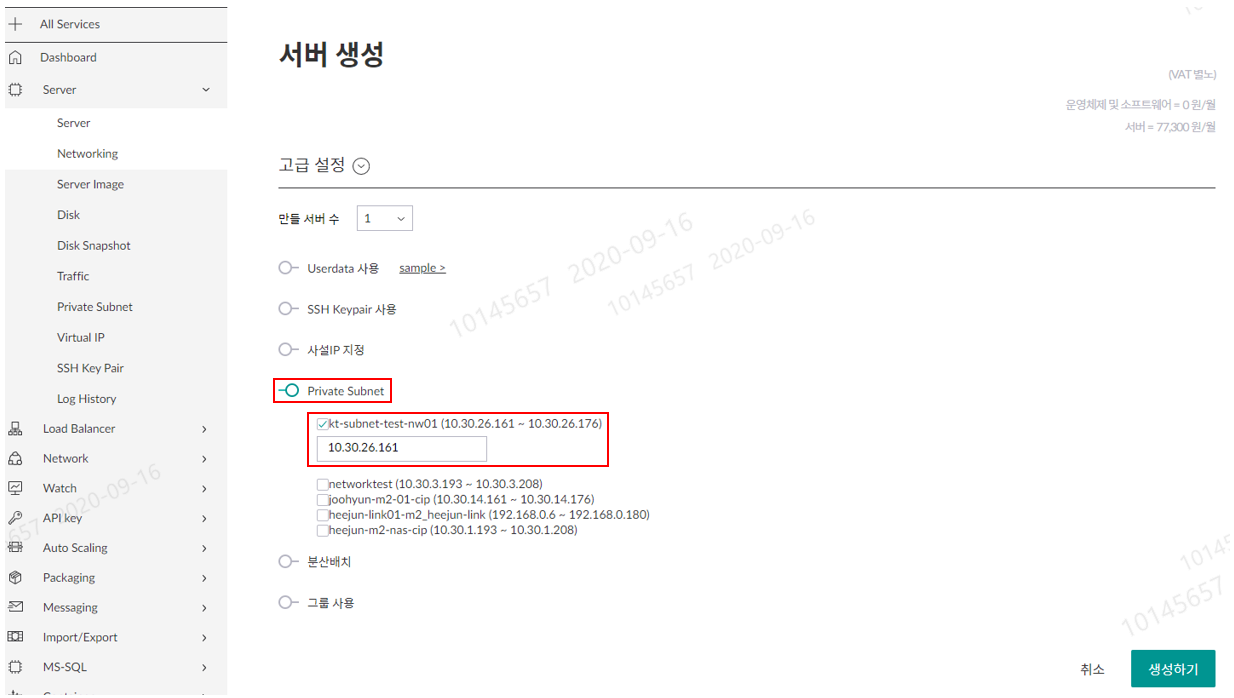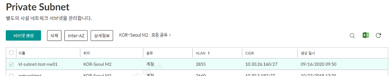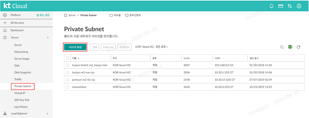KT Cloud server -> Private Subnet -> '서브넷 생성'