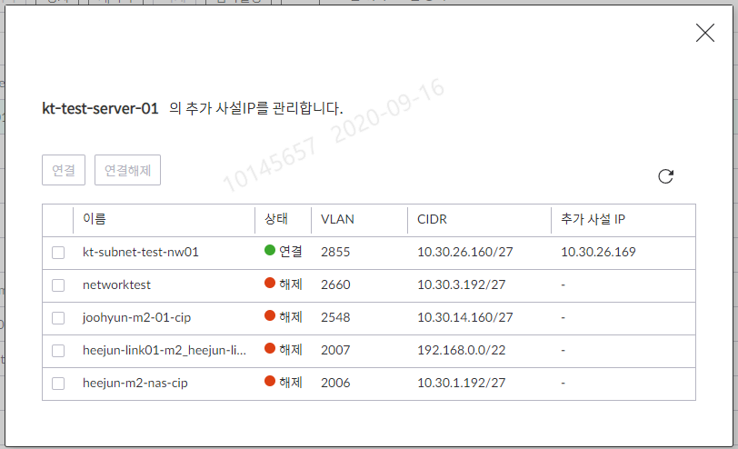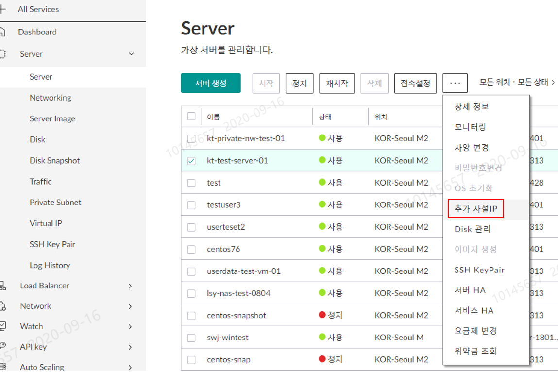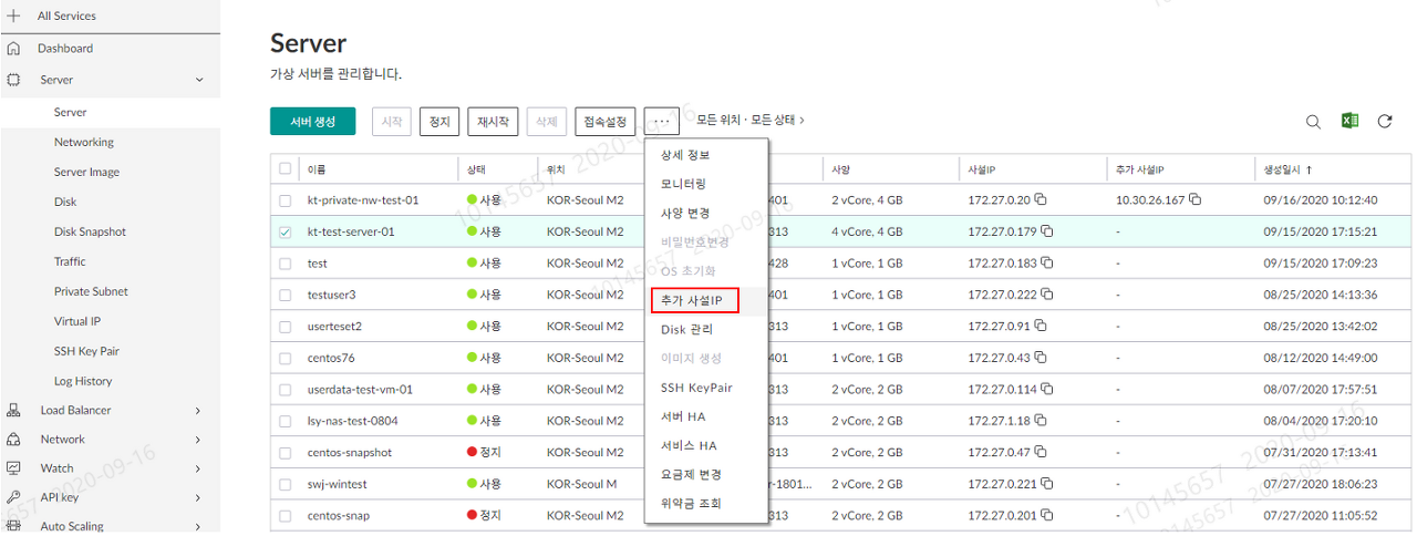 클라우드콘솔 -> KT Cloud server -> 추가 사설 IP 메뉴 '클릭'