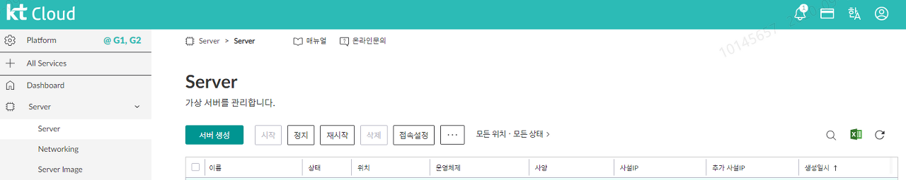 클라우드 콘솔 KT Cloud server -> 서버생성 “클릭”