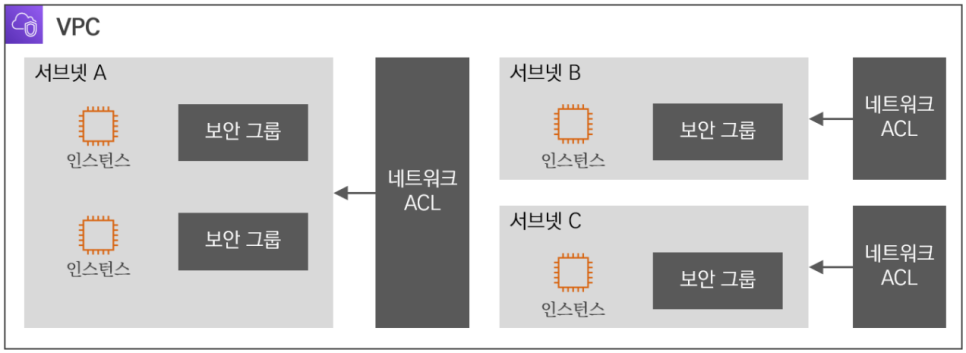 VPC는 인스턴스 레벨과 서브넷 레벨 상에서 대상을 필터링 할 수 있는 보안 기술을 사용할 수 있습니다. 인스턴스 레벨에서의 보안 기술은 보안 그룹이며, 서브넷 레벨에서의 보안 기술은 네트워크 ACL 입니다.