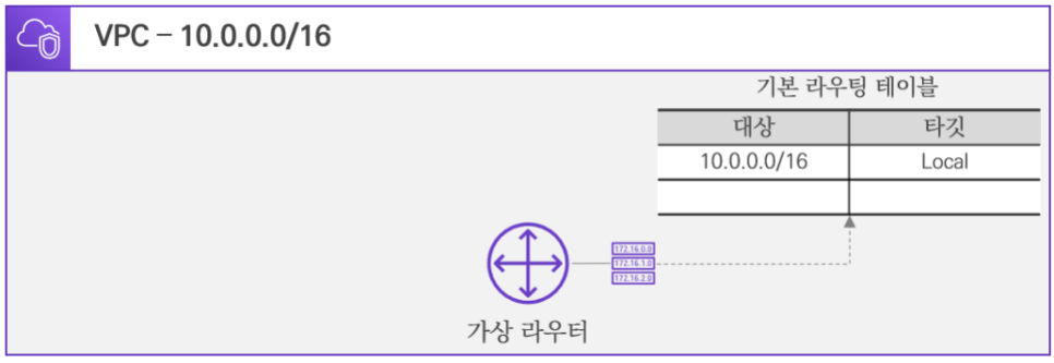 VPC를 생성하면 가상 라우터가 자동 생성됩니다. 이 가상 라우터는 라우팅 테이블을 가지며 목적지 네트워크로 라우팅하여 통신합니다.