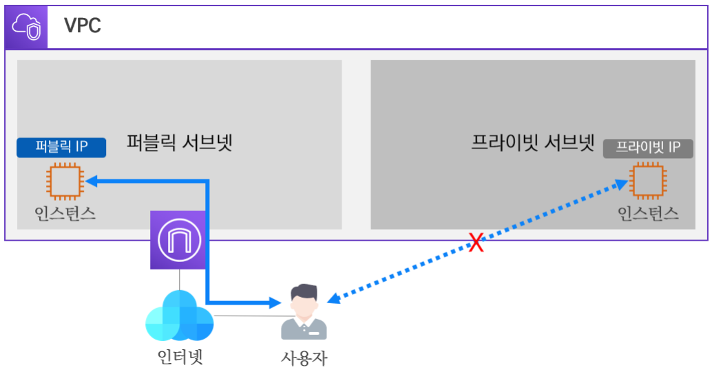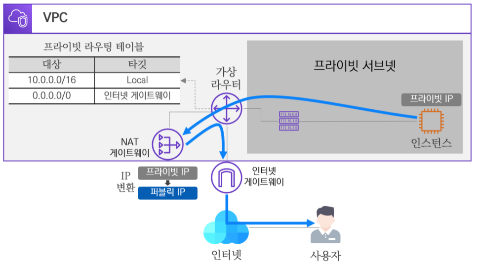 * 이 때, 프라이빗 서브넷에서 외부 인터넷으로 통신은 가능하지만 외부 인터넷에서 프라이빗 서브넷으로 통신은 불가능합니다.