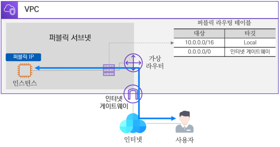 인터넷 게이트웨이는 VPC 당 1개만 연결이 가능합니다. 외부 인터넷 구간으로 통신할 수 있는 대상은 퍼블릭 IP를 사용하는 퍼블릭 서브넷 내의 자원이며, 자신의 라우팅 테이블에 외부 인터넷 구간으로 나가는 타깃을 인터넷 게이트웨이로 지정해 주어야 합니다.