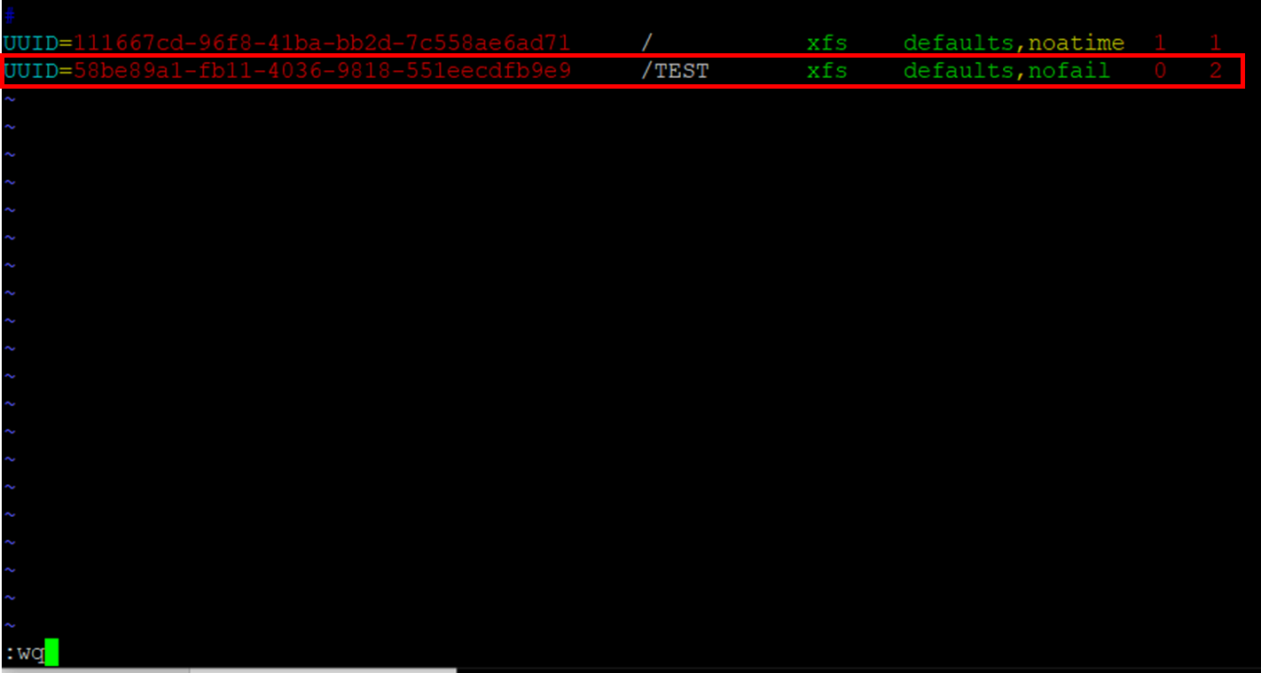 (다음 예제에서는 UUID가 58be89a1-fb11-4036-9818-551eecdfb9e9인 디바이스를 탑재 지점 /TEST에 탑재하고 xfs 파일 시스템을 사용합니다.
