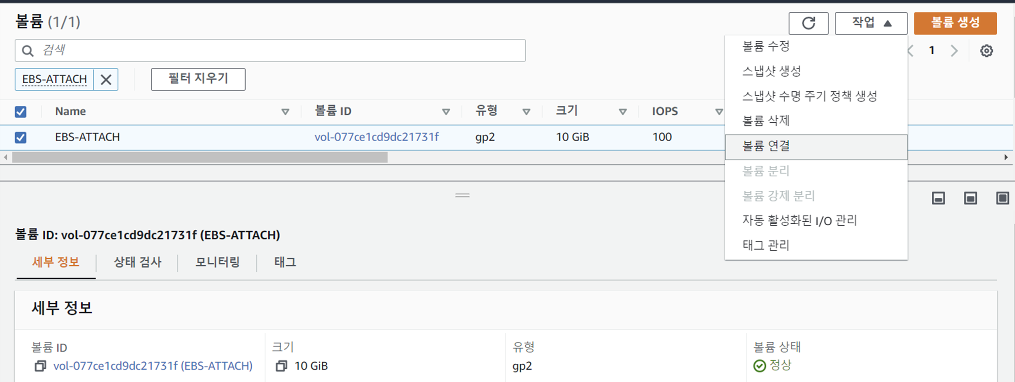 4. 볼륨 생성 확인 및 EC2에 부착을 위해 '볼륨 연결' 클릭