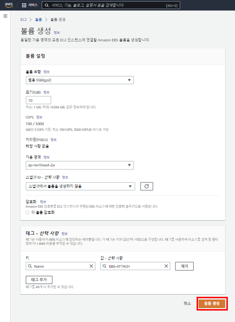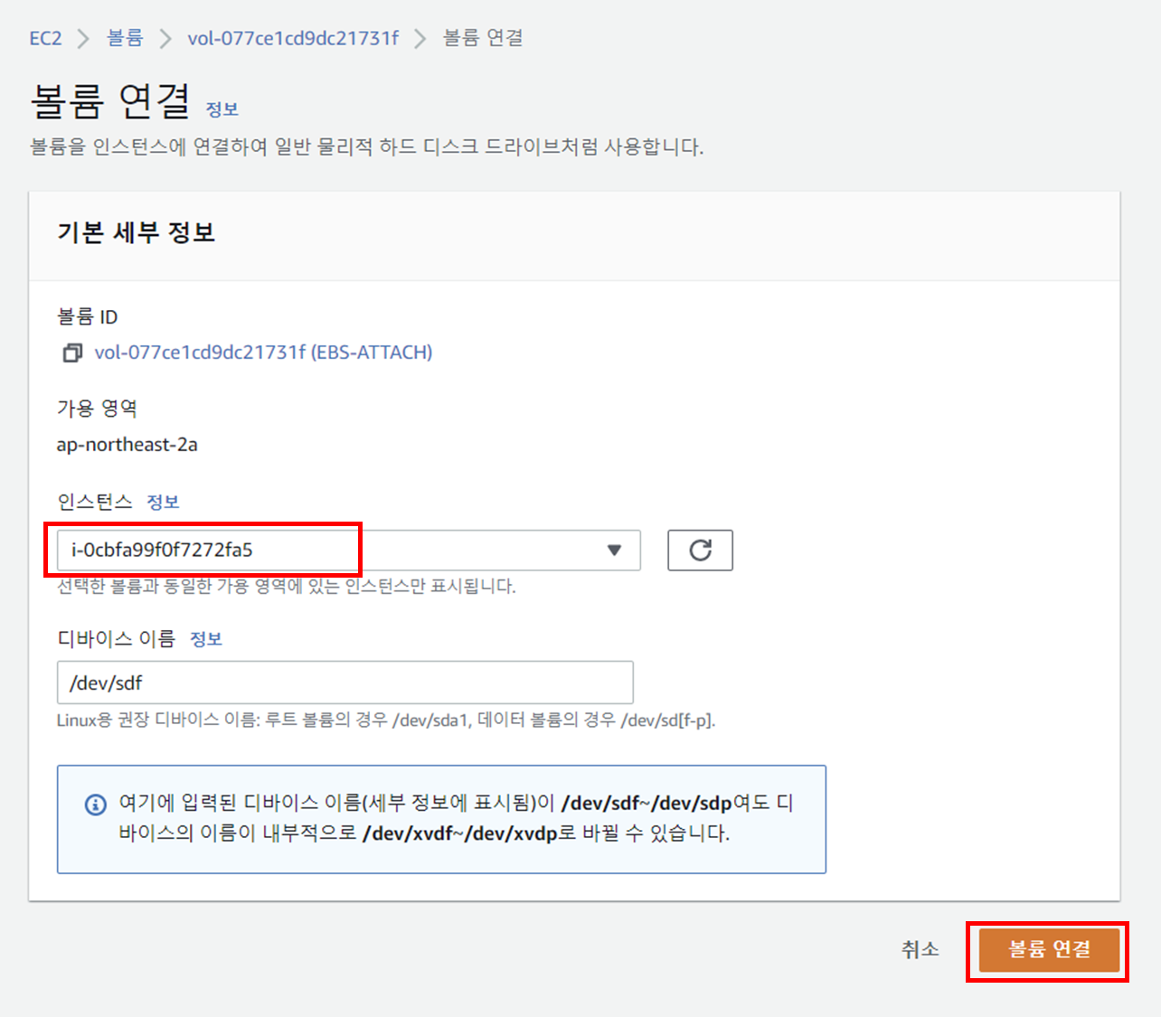 (앞서 생성한 볼륨과 인스턴스는 같은 가용 영역에 위치해야 합니다.)