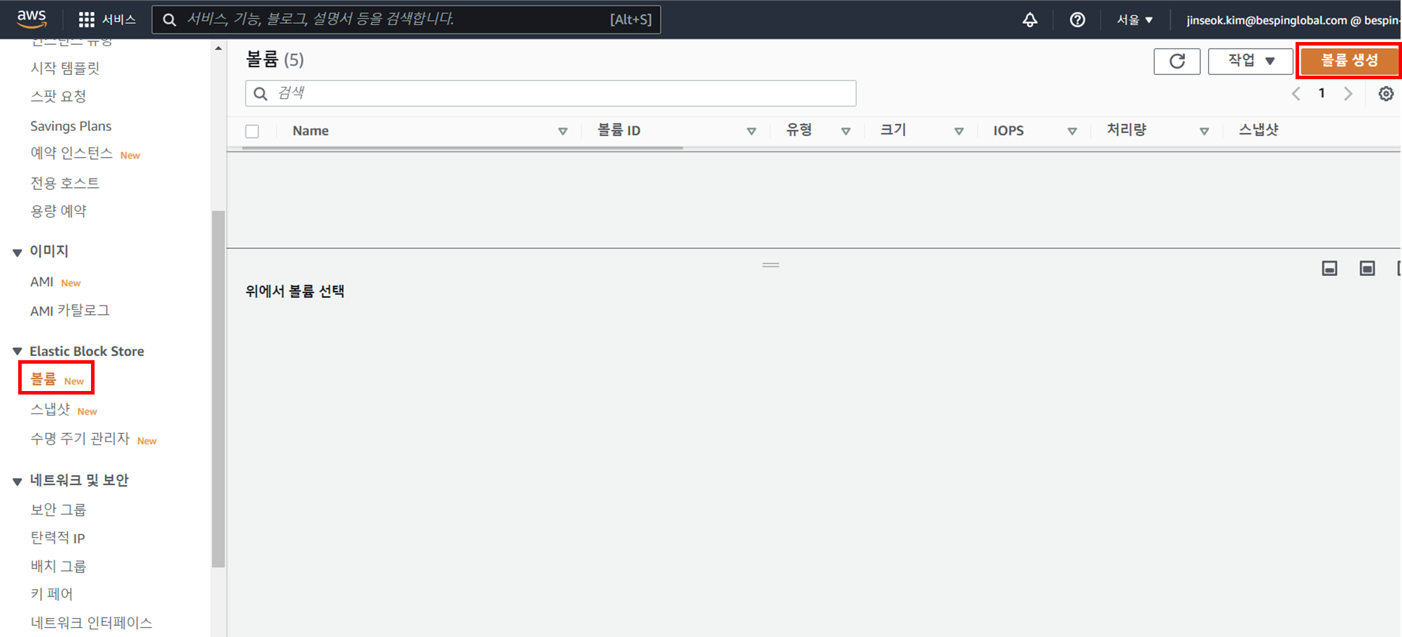 2. 생성한 EC2에 부착할 추가 볼륨을 생성하기 위해 '볼륨' - '볼륨 생성' 클릭