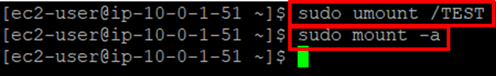 7. 항목이 제대로 작동하는지 확인하기 위해, 다음 명령을 실행해 디바이스 탑재를 해제하고 /etc/fstab에서 모든 파일 시스템을 탑재합니다.