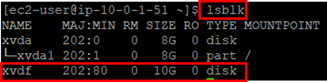 1. 앞서 생성한 EC2 접속 후 lsblk 명령어를 통해 앞서 부착한 볼륨 확인