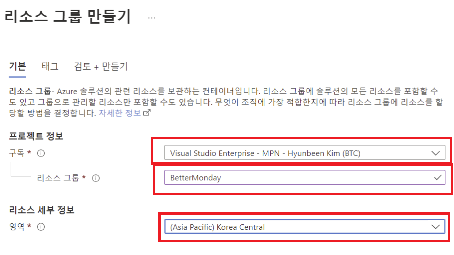 - 새로운 리소스 그룹을 만들어 줍니다. 구독을 설정하고, 리소스그룹 이름과 영역을 선택합니다.