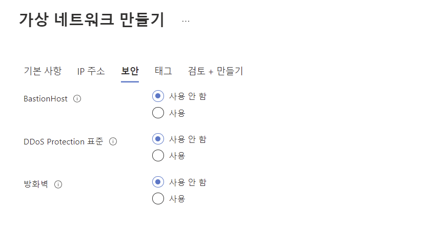- Azure는 AzureBastion 이라는 자체 서비스가 있지만, 저희는 JumpBox를 사용하여 진행할 것이기 때문에 사용하지않습니다. 모두 [사용 안 함] 선택 합니다.